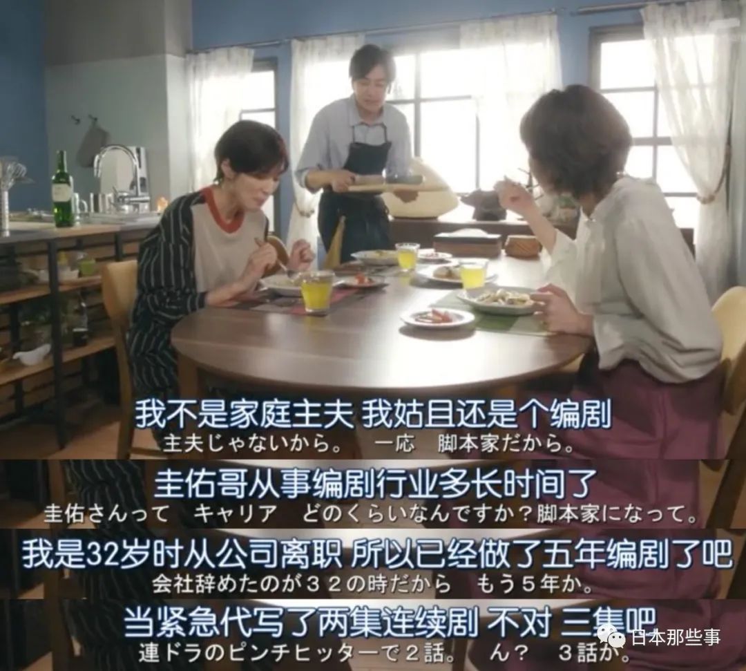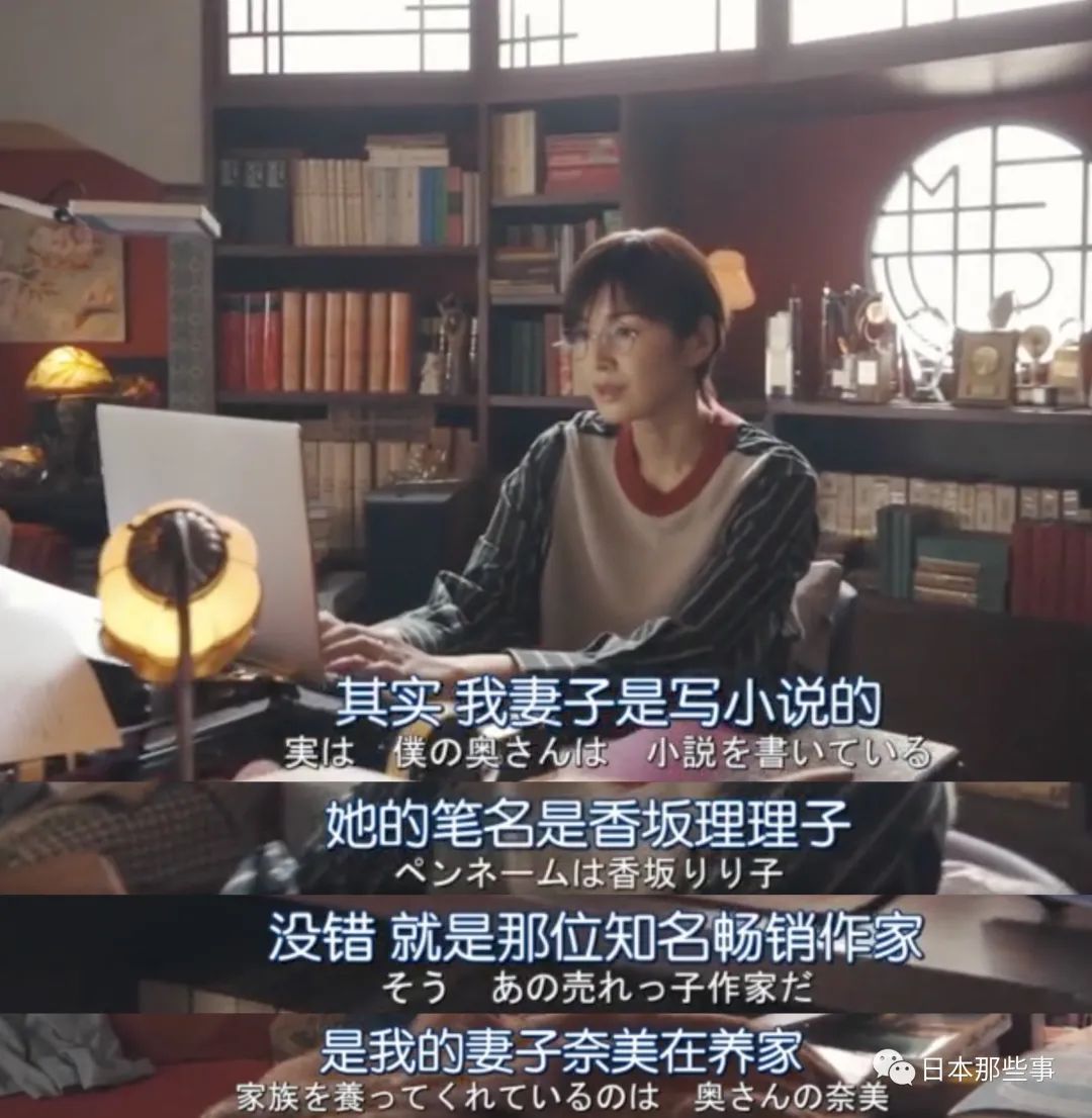 虽然事业发展得不太顺利,但有一位温柔且能赚钱的妻子——美智子姐姐饰演的奈美。奈美是一名畅销书作家,收入丰厚,二人互相扶持,经营着温馨的家庭生活。