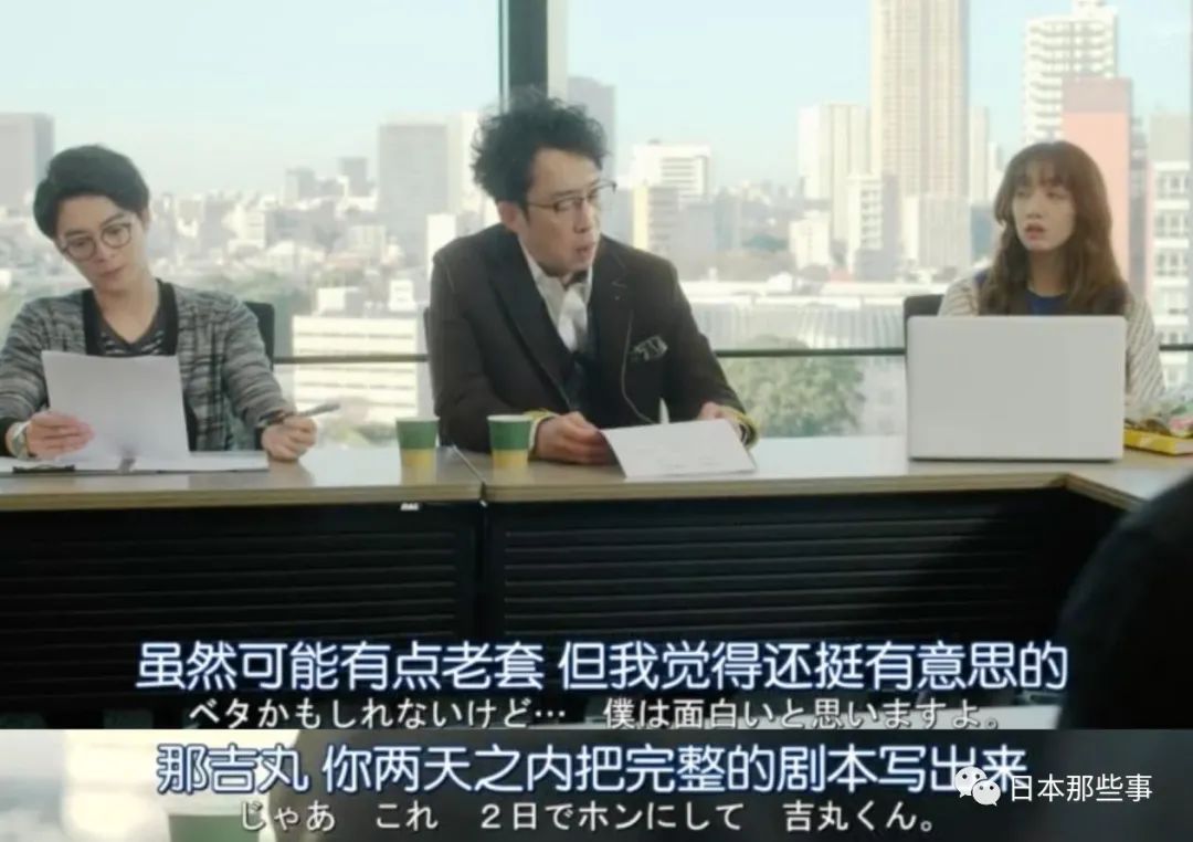 吉丸到了电视台,没想到电话里毕恭毕敬的制作人,在碰头会上却像连珠炮一样,直截了当地说出了让吉丸写剧本的原因:原定的编剧受伤了,临时又找不到人,虽然吉丸不是什么名编剧,但凑合顶上吧。