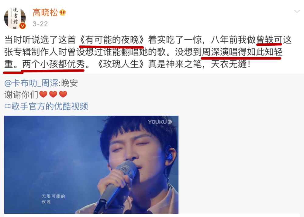 虽然在刚刚完结的《歌手2020》中,周深翻唱了曾轶可的《有可能的夜晚》没有能被节目组用该有的头像“善待”,但是高晓松在社交平台上还是要把夸赞曾轶可的话再次说给大家听,曾轶可和周深都是高晓松看好的优质歌手。
