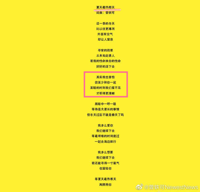 而曾轶可的第二首歌是《夏天最热那天》,这首歌的歌词也非常令人感同身受。“其实我也害怕,但至少和你一起,至暗的时刻我们看不见,才听得更清晰。”