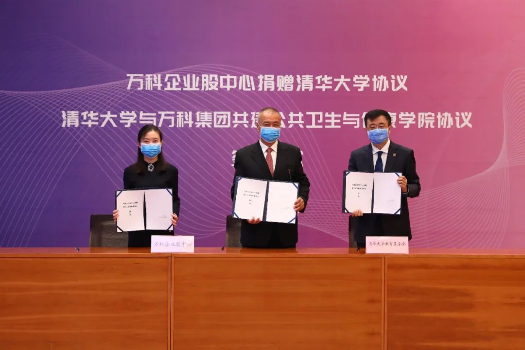 2020年4月2日,万科企业股资产管理中心与清华大学教育基金会签署了捐赠协议,代表万科人全体,将企业股中心的全部资产2亿股万科股票一次性捐赠给清华大学教育基金会,用于设立“清华大学万科公共卫生与健康学科发展专项基金”。清华大学党委书记陈旭、校长邱勇,万科集团董事会名誉主席王石、万科集团董事会主席郁亮和清华大学万科公共卫生与健康学院院长陈冯富珍出席了签约仪式,清华大学常务副校长王希勤主持仪式。
