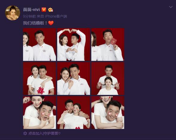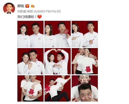 5月21日13点14分,郑恺与苗苗在微博晒结婚照官宣结婚喜讯,两人发文写道:“我们结婚啦!”在晒出的照片中,郑恺与苗苗穿着印有“2020.5.21”字样的情侣服,看起来十分甜蜜。